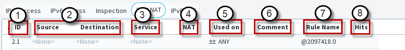 The following illustration shows a NAT rule that has just been inserted into a policy. The Source, Destination, and Service cells are set to <None> and they must be changed to something else for the rule to match any traffic. The Used on cell is also used for traffic matching: you can add specific Engine elements to this cell to make the rule valid only on those engines, or you can leave it to the default ANY to make the rule valid on all engines where the policy is installed. The columns are in the default order, but you can drag and drop them to your preferred order.