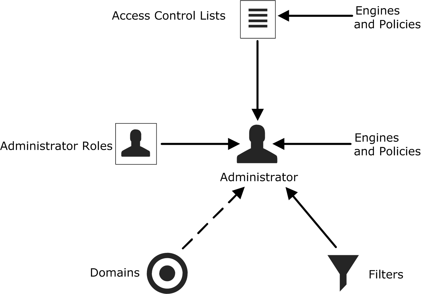 Many elements are used in the configuration of administrator accounts, including Security Engine, Policy, Access Control List, Administrator Role, and Filter elements.