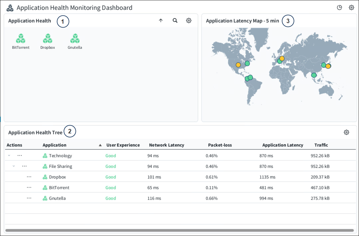 - Application Heath: Displays the overall health status of network applications being monitored.