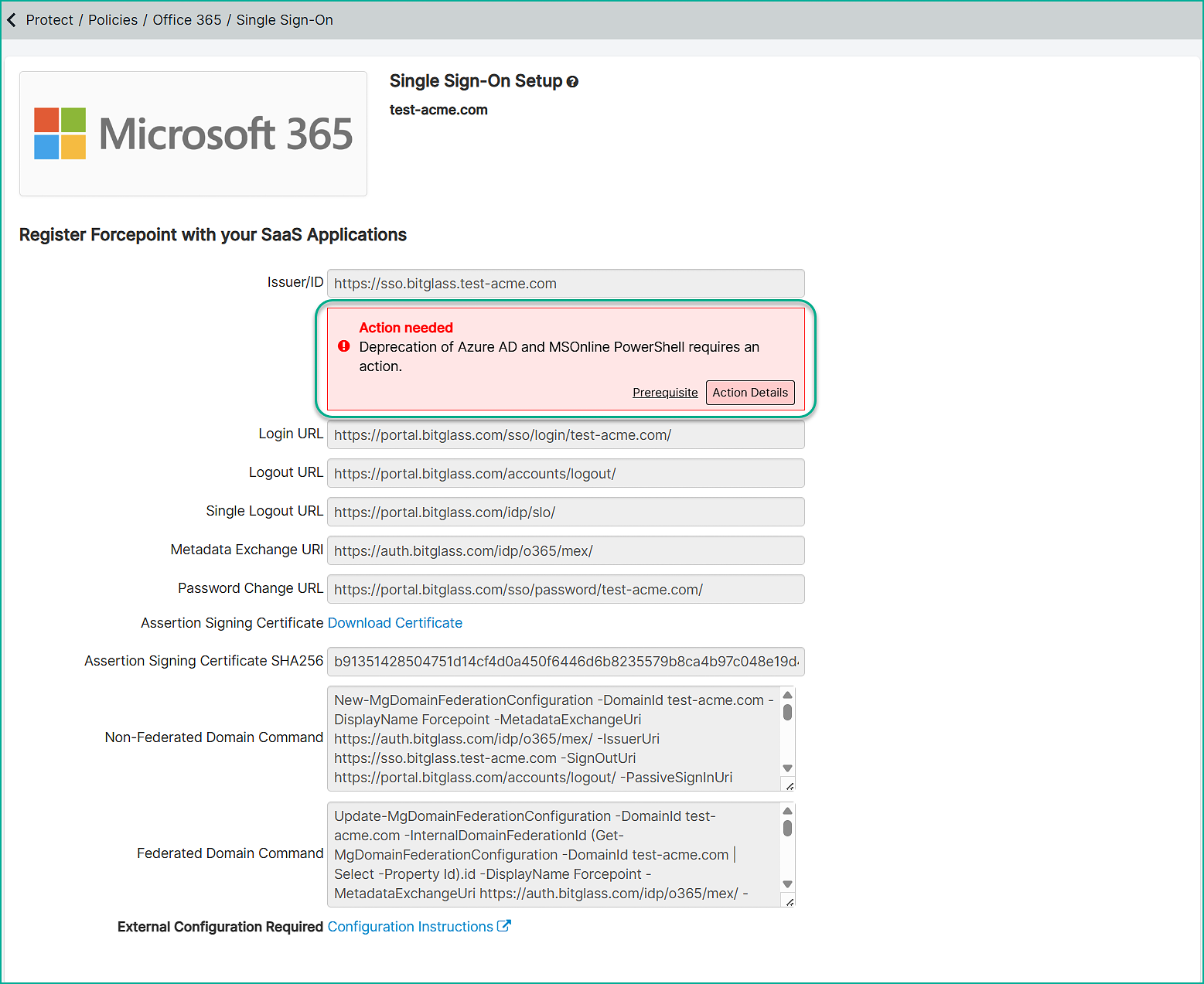 Install-Module Microsoft.Graph -Scope CurrentUserConnect-MgGraph -Scopes "Domain.Read.All"Get-MgDomain -DomainName yourdomain.comNote: Replaceyourdomain.comwith the domain for which you are checking the status.If the Authentication Type is set to Federated and configured to point to Forcepoint, then you are all set.