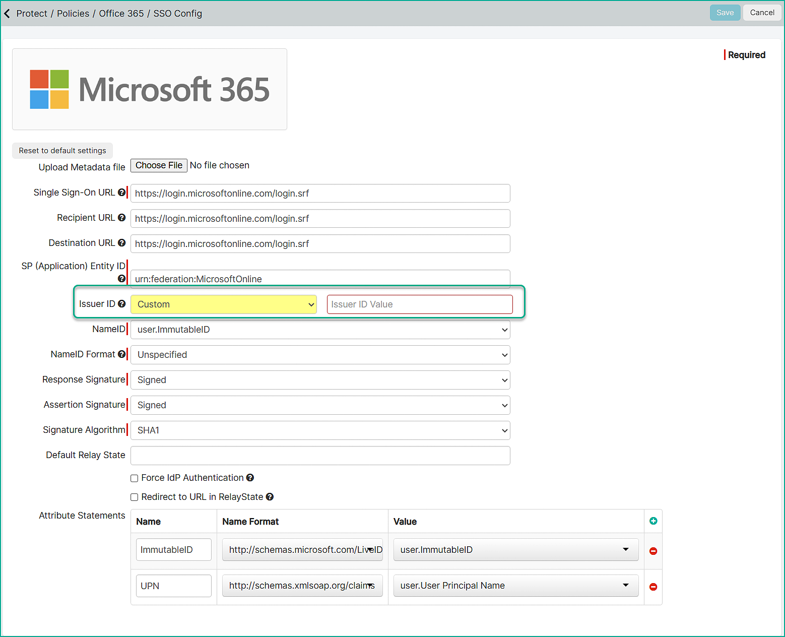 From the Issuer ID drop-down, select Custom. In the Issuer ID Value field, paste the value copied in the