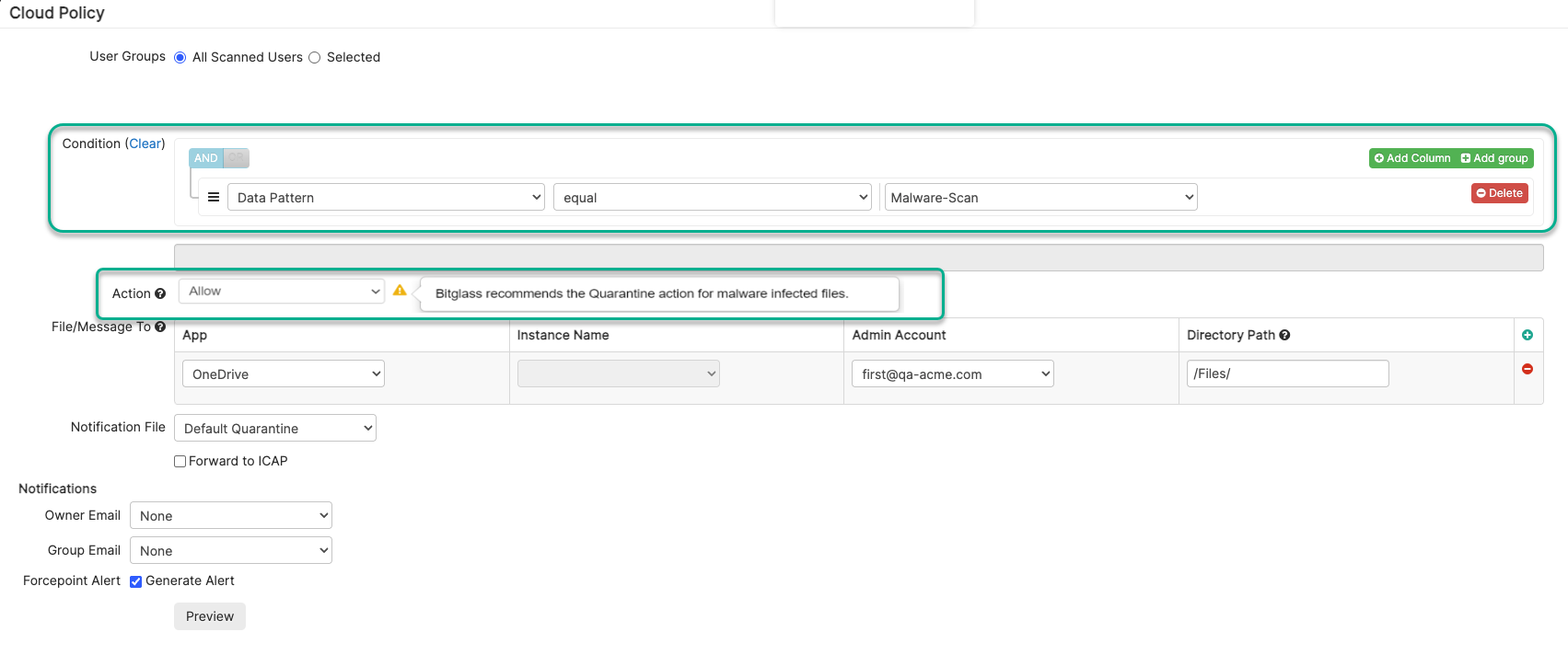 Setting up ATP scanning in proxy/inline policy for your cloud application, is same as configuring any other data pattern in a policy with minor difference. Malware scanning only applies to files during download or upload.