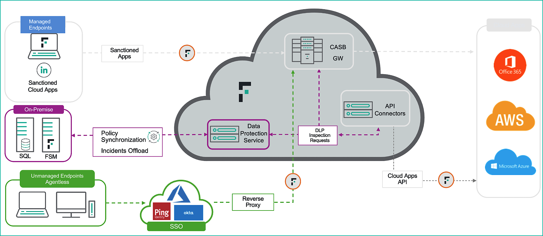 Forcepoint Data Security Cloud | App Security provide data security and access management for SaaS applications, ensuring safe and compliant cloud usage. Security teams rely on CASB to perform the following types of functions: