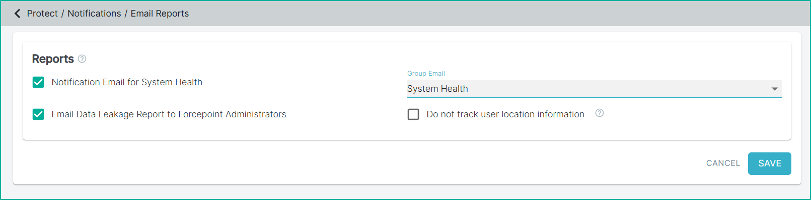 Check the box labeled Email Data Leakage Report to Forcepoint Administrators to enable notifications for data leakage reports.
