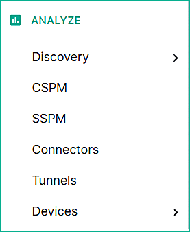 - Discovery: Where you can configure proxy/firewall log upload or streaming to generate and view your ShadowIT reports.