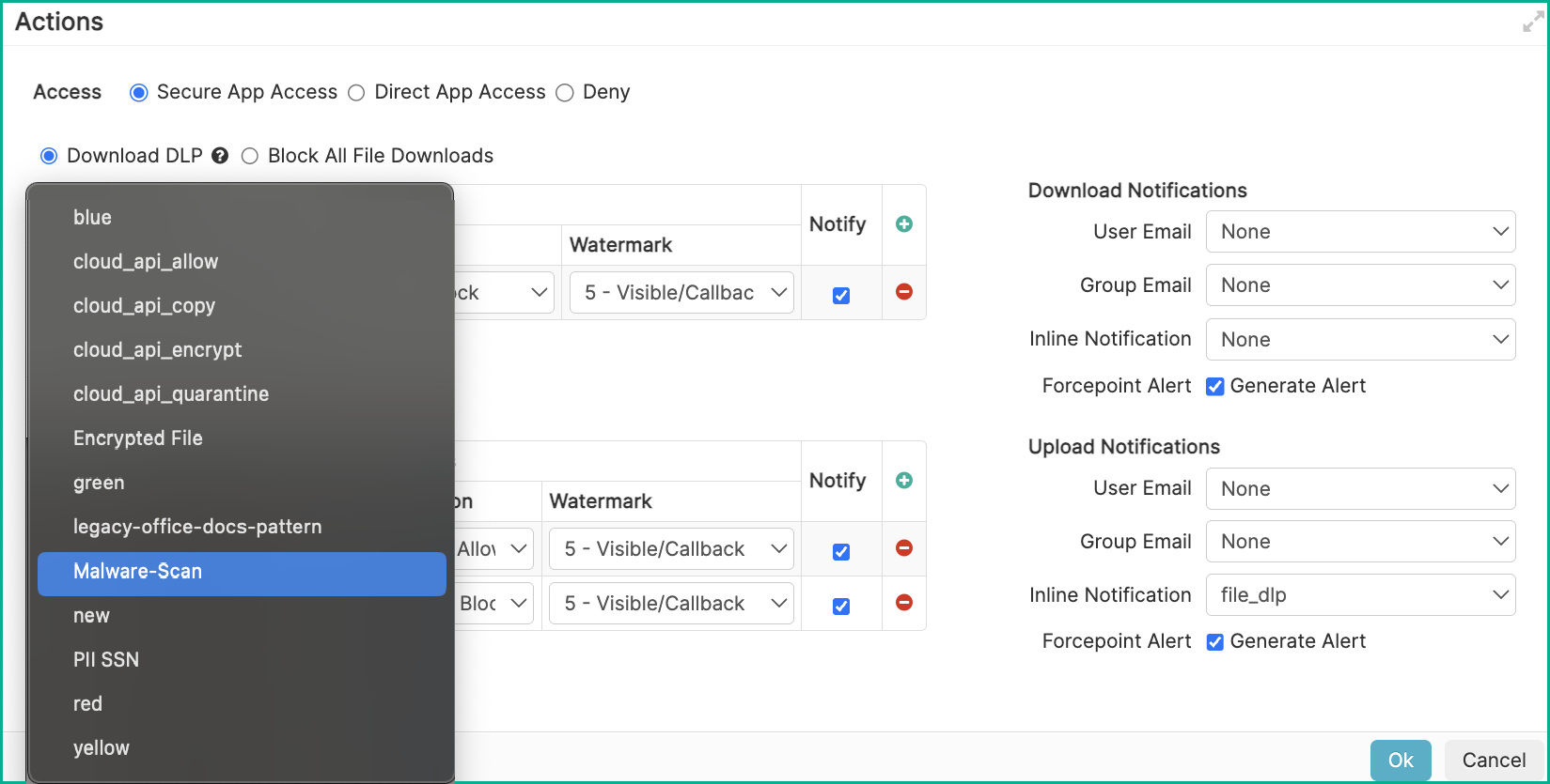 - Block/Deny and Allow are the only available policy actions since Forcepoint Data Security Cloud | App Security will not attempt to