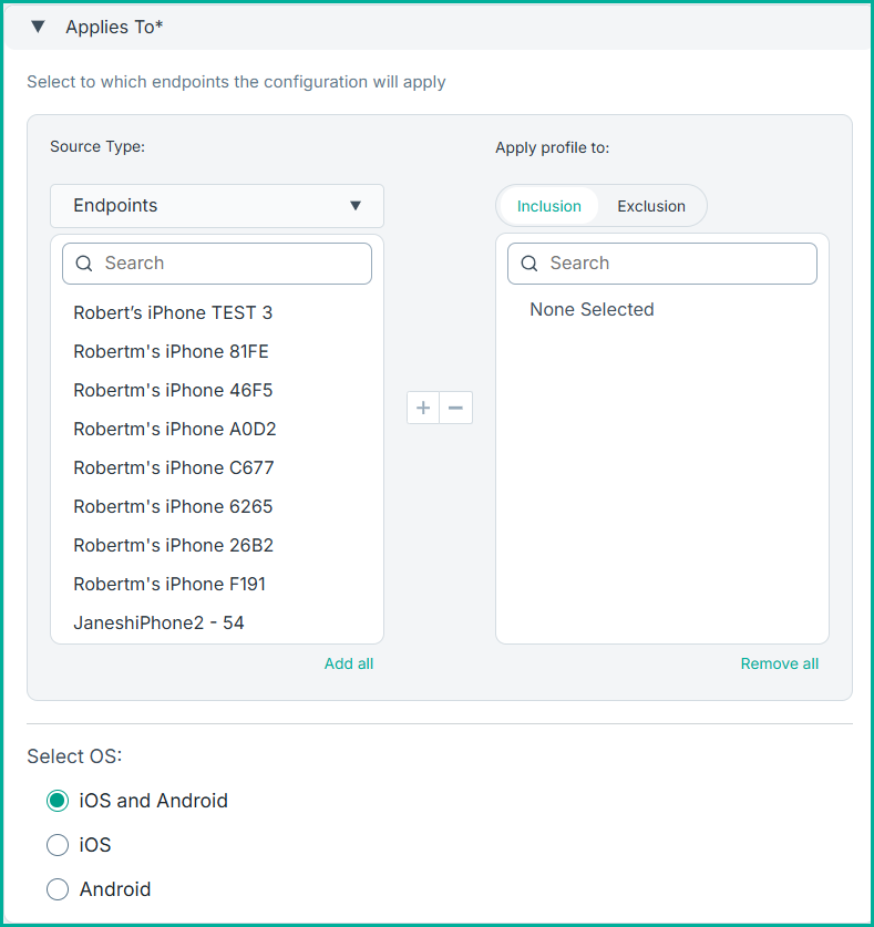 - Select to which endpoints the configuration will apply: Determines which endpoints the profile should target.