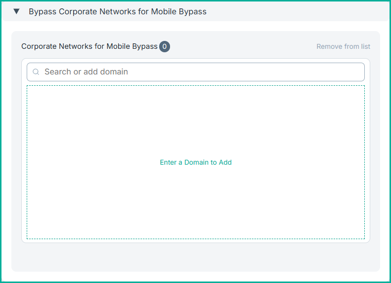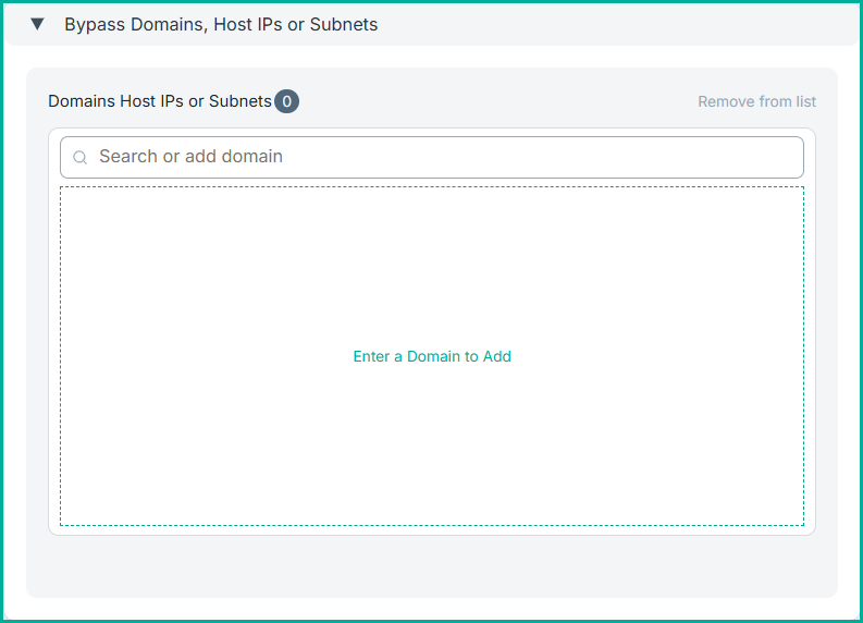 Add domains or host IP addresses that should be bypassed by the Mobile Endpoint Agent on the device. To add an entry, search for the required domain, IP address, or subnet, and click Enter to add it to the list. To remove any entry, select it from the list and click Remove from list.