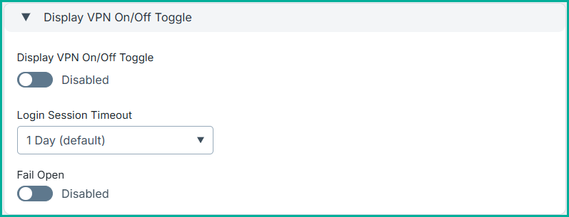 - Display VPN On/Off Toggle: Allow the admin to configure a toggle button for the application.