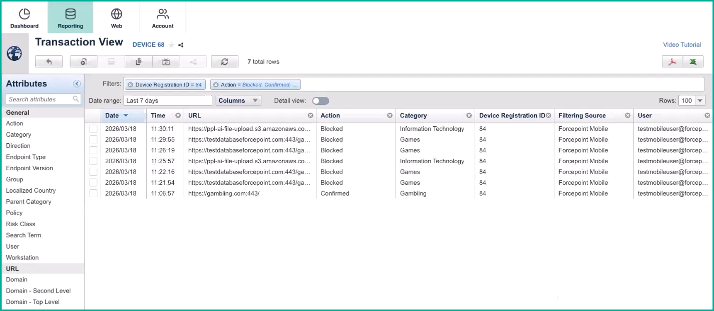 Admins can review detailed browsing events, verify policy enforcement, and investigate security‑related actions generated during mobile traffic inspection. Every web request is logged and available for analysis.