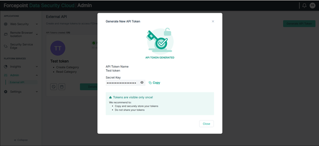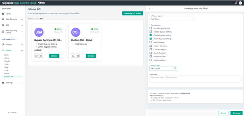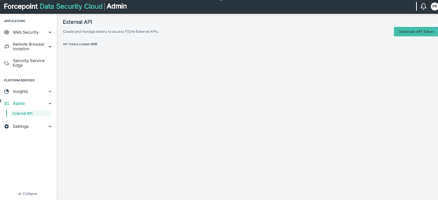 Creating the API token via the UI: An API token (api-key-string) must be created in the Web Security Cloud. Navigate to the Platform Services > Admin >