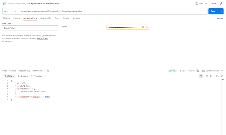 token (generated in step b) in the Authorization header of each request. The example below shows an example to Get certificate verification SSL Bypass Settings using Postman. For