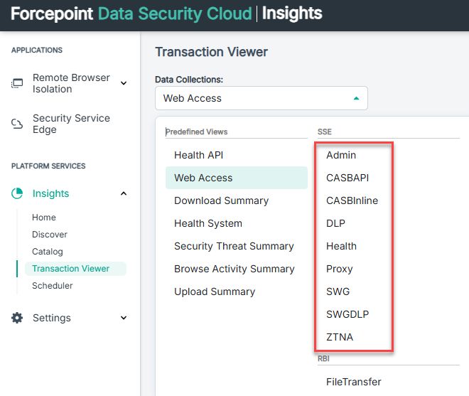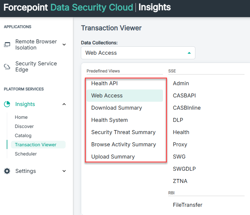 Admins can access predefined views in the Transaction Viewer for CASB Inline, SWG, and CASB API logs. Also, provide consistent and familiar experience while leveraging the performance and usability of the new platform.