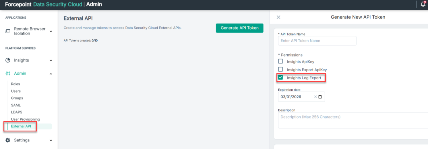 - Insights Host: Enter the Insights Host. For example: <tenanthost>.insights.forcepointone.com
