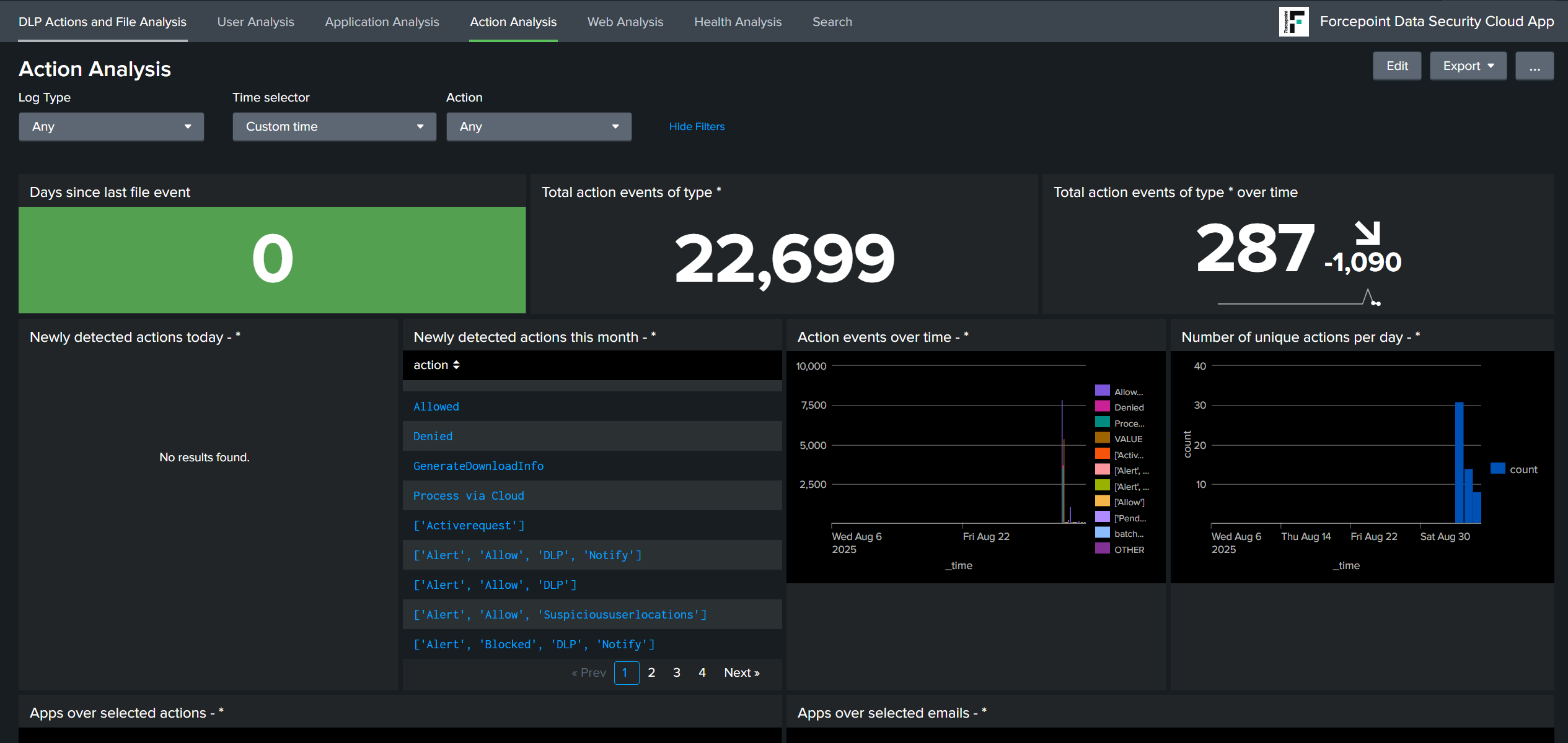 - Once you click Save you will be taken to the Forcepoint Data Security Cloud app Dashboard. Give it a few minutes before logs are pulled over and you