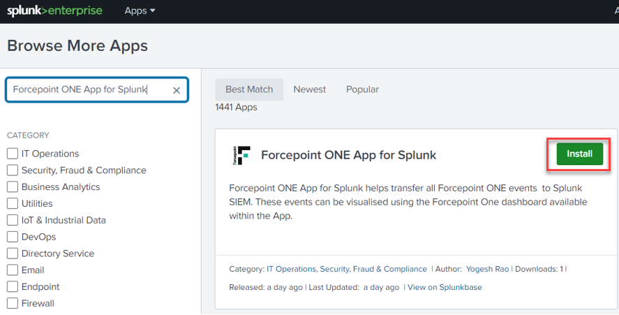 - From the search results, click Install on the Forcepoint Data Security Cloud App for Splunk title.