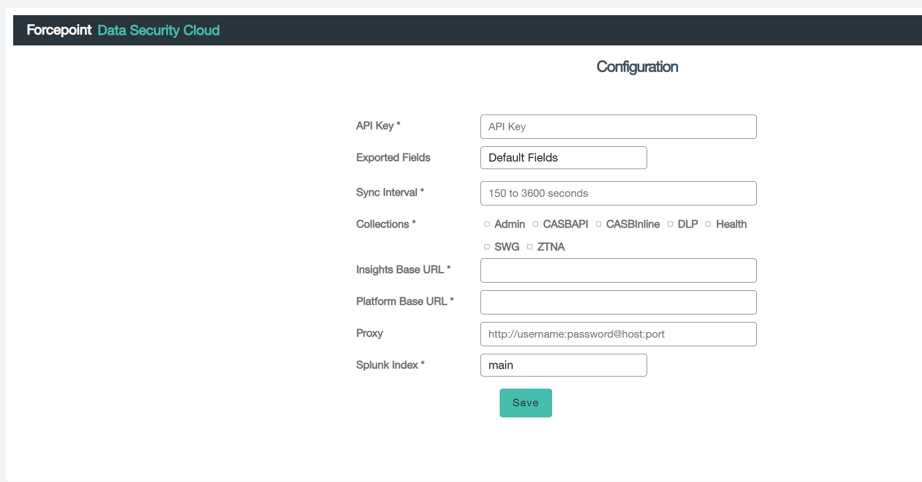 DLP, Health, Admin, CASBAPI, CASBInline, and ZTNA logs. Follow the steps mentioned below to configure Forcepoint Data Security Cloud App in Splunk.Prerequisites