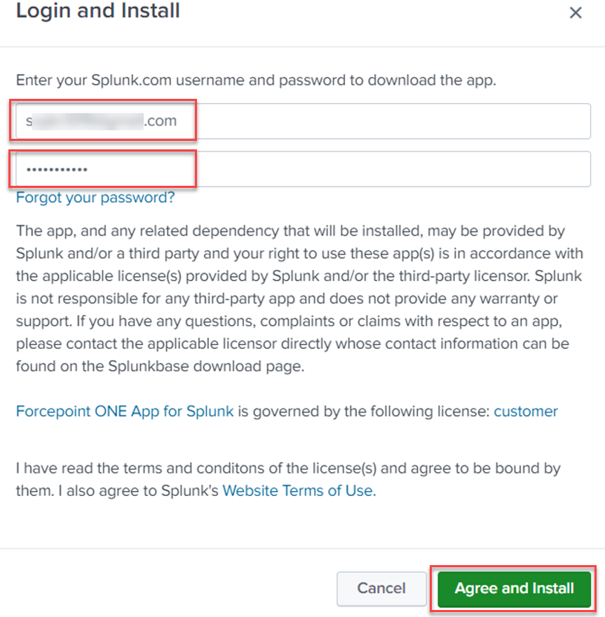 - Enter your Splunk account login credentials and click Agree to Install. It will require you to restart your Splunk instance.