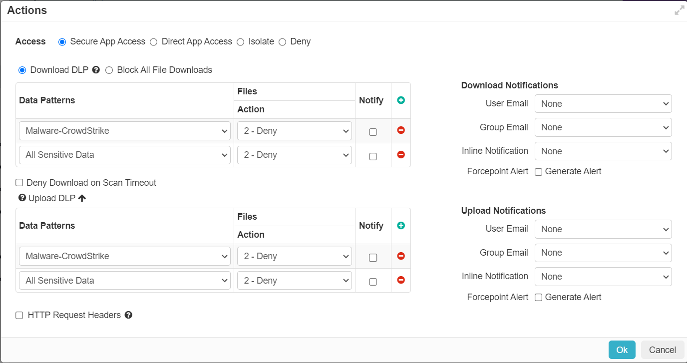 For example, the following images display a SWG Content Policy line with Secure App Access to deny download and upload actions when any data pattern identifying sensitive data was matched.
