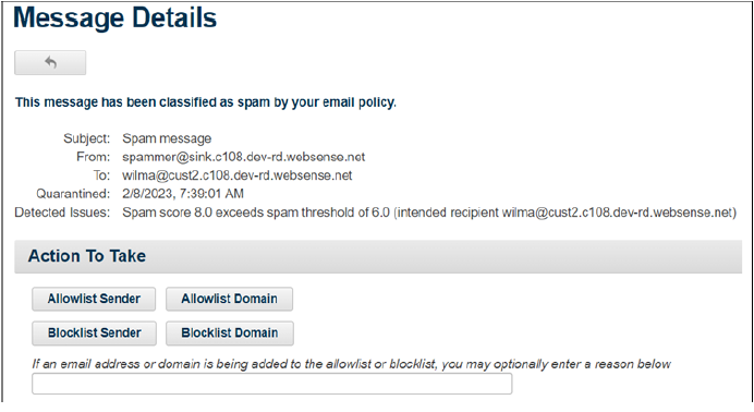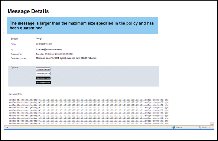 In this example a message was quarantined because it exceeded the maximum size specified in the policy. (The message is over 1 GB.) Note that the user can add the sender or sending domain to the antispam allowlist or blocklist. These lists bypass antispam processing; they do not bypass the policy’s message size restrictions. If the antispam allowlist and blocklist options are not enabled on the policy, the buttons do not display.