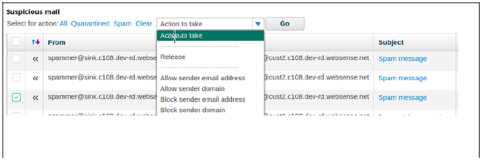 When looking at the online version of their report, users can take action on all of the messages in their quarantine at once. To do so, they click Quarantined, then select an action to take from the drop-down list.