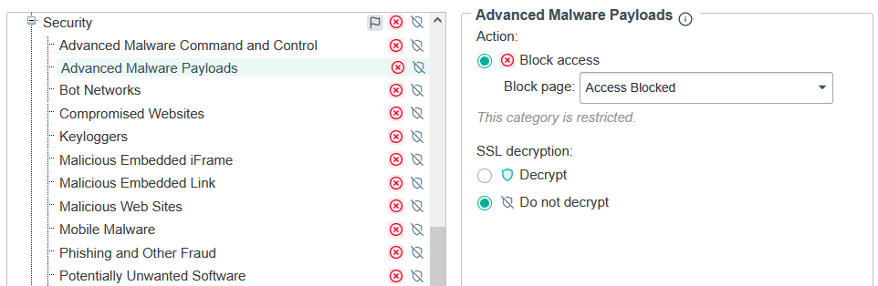 To protect end-users from accessing risky destinations and to protect the integrity of Forcepoint’s cloud infrastructure, a select group of high-risk security categories is restricted from modification and is automatically set to disposition with Block Access. Administrators can select or create an alternative block notification page if they prefer not to use the default one.