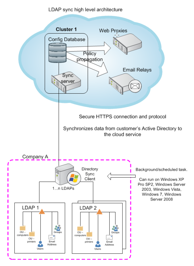 The synchronization client resides on a computer at the customer’s site and accesses one or more LDAP directories via the customer’s network. If more than one LDAP directory is accessed, then this data can be merged together by the synchronization client before it is synchronized with the cloud service.
