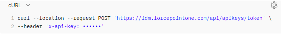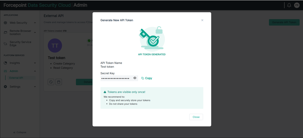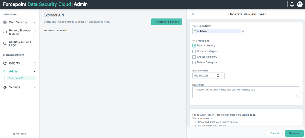 Creating the API token via the UI: An API token (api-key-string) must be created in the Web Security Cloud. Navigate to the Platform Services > Admin > External API and click the Generate API Token button.