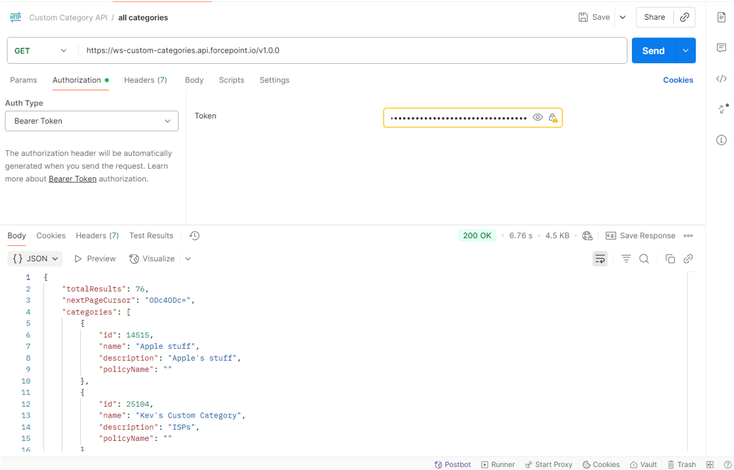 (generated in step b) in the Authorization header of each request. The example below shows an example to Get All custom categories using Postman. For more information about the